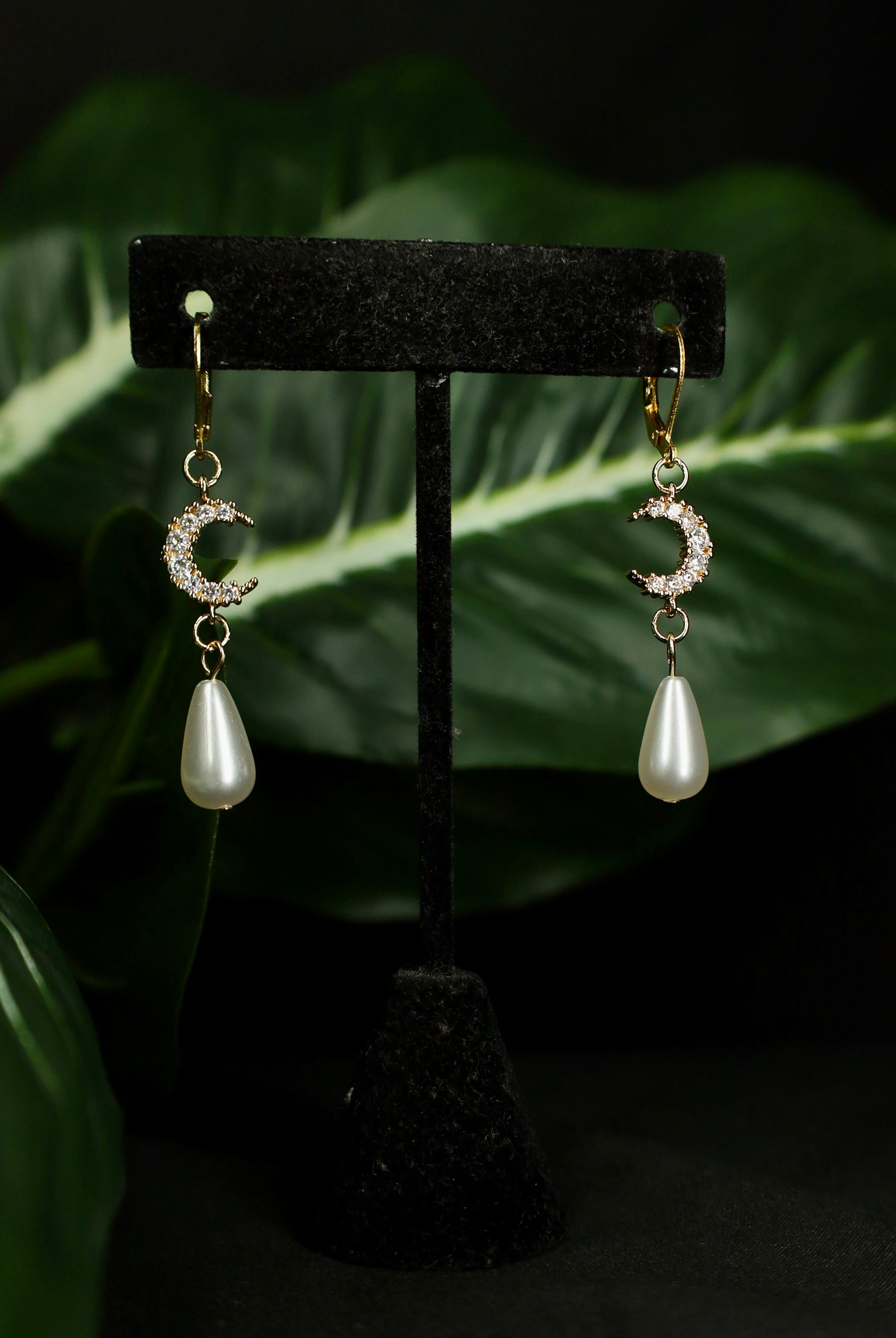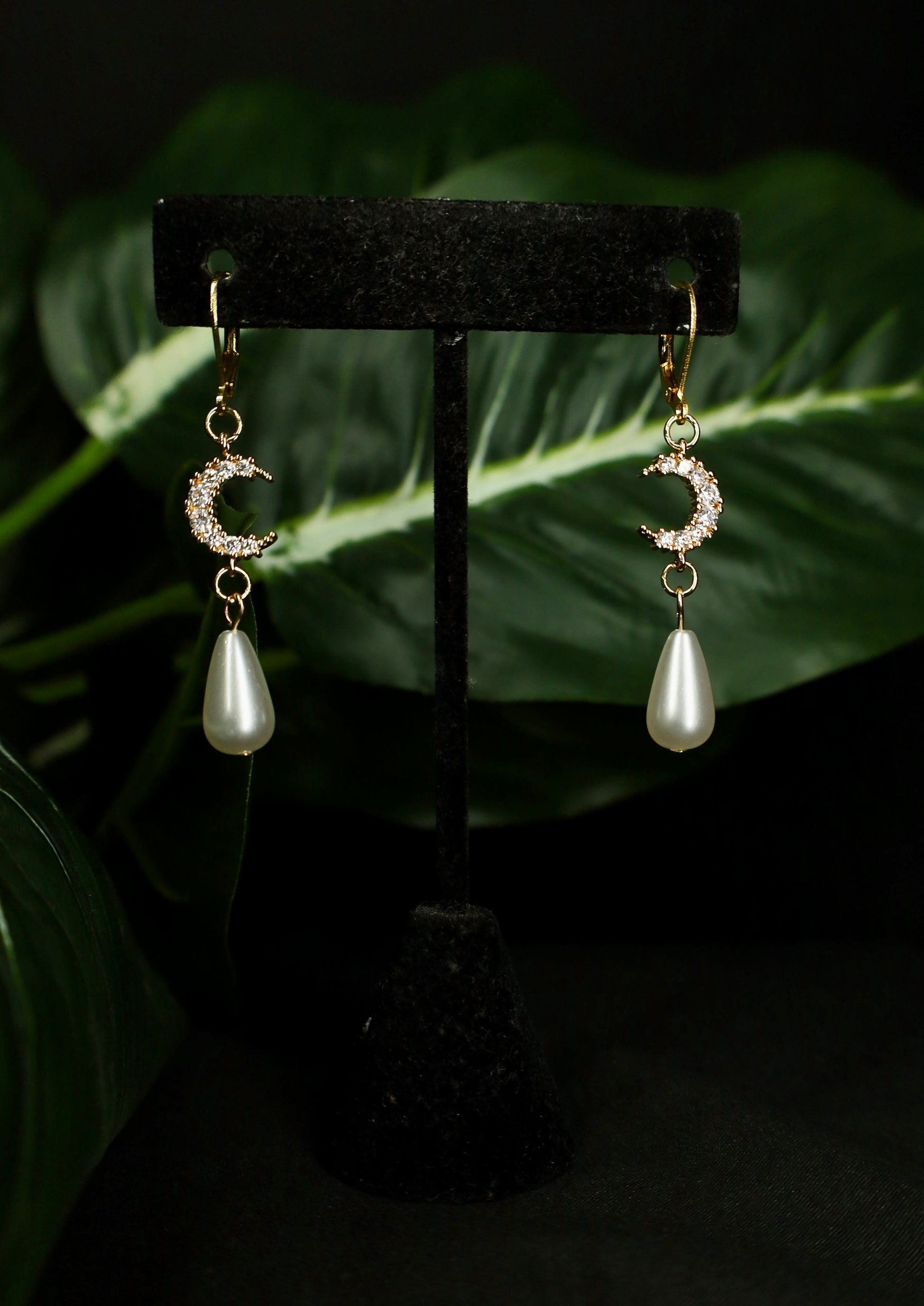 Crystal, Cubic Zirconia moons, featuring teardrop pearls. Cubic zirconia, gold plated earring posts are hypo allergenic and nickel free. Earrings measure approximately 1.25 inches long.