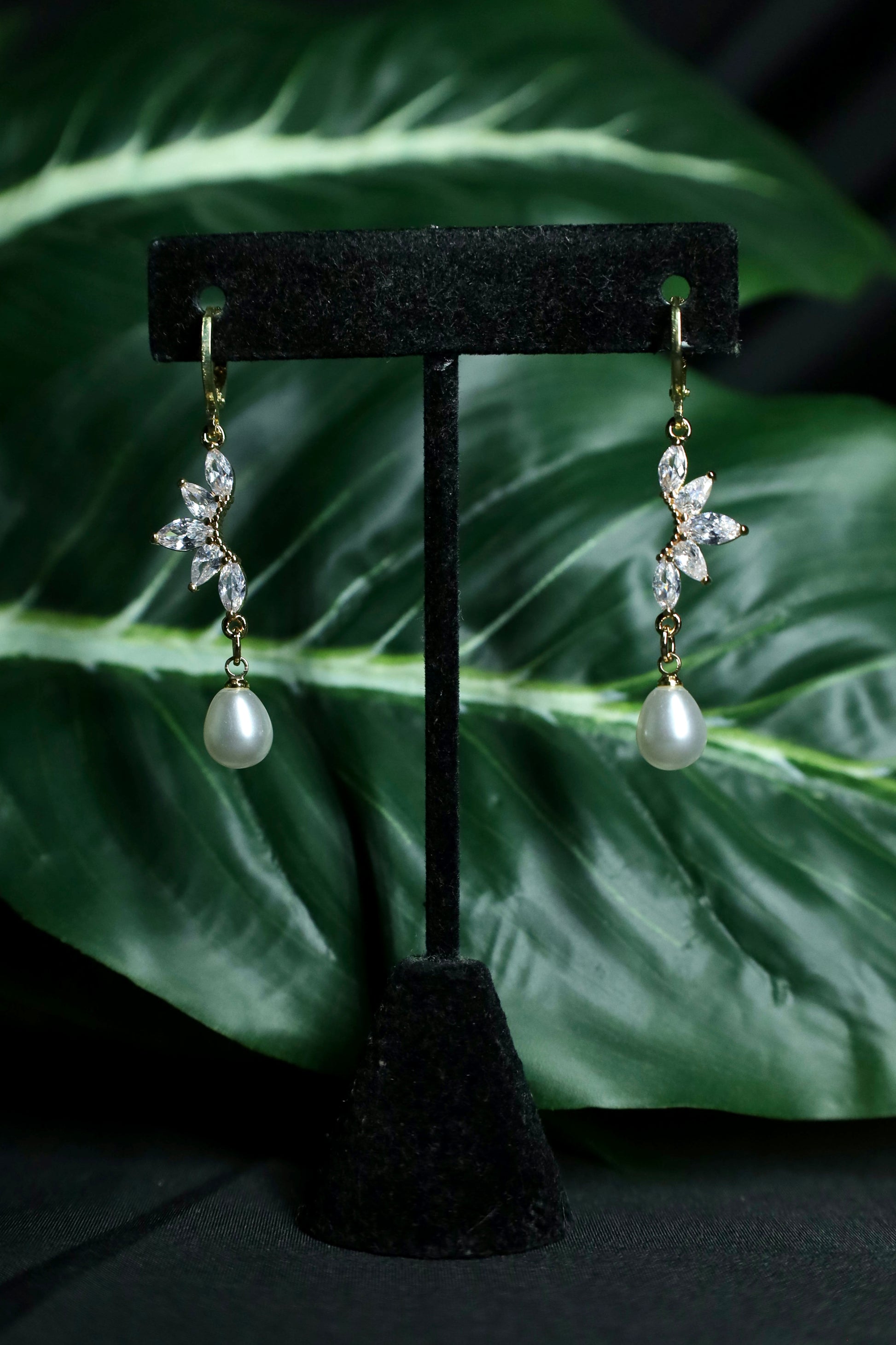 Our Stunning Sunflower earrings boast sparkling cubic zirconia and a captivating white pearl drop. The reliable gold-plated, nickel-free earring hooks guarantee hypoallergenic comfort. These earrings measure roughly 2 inches in length.