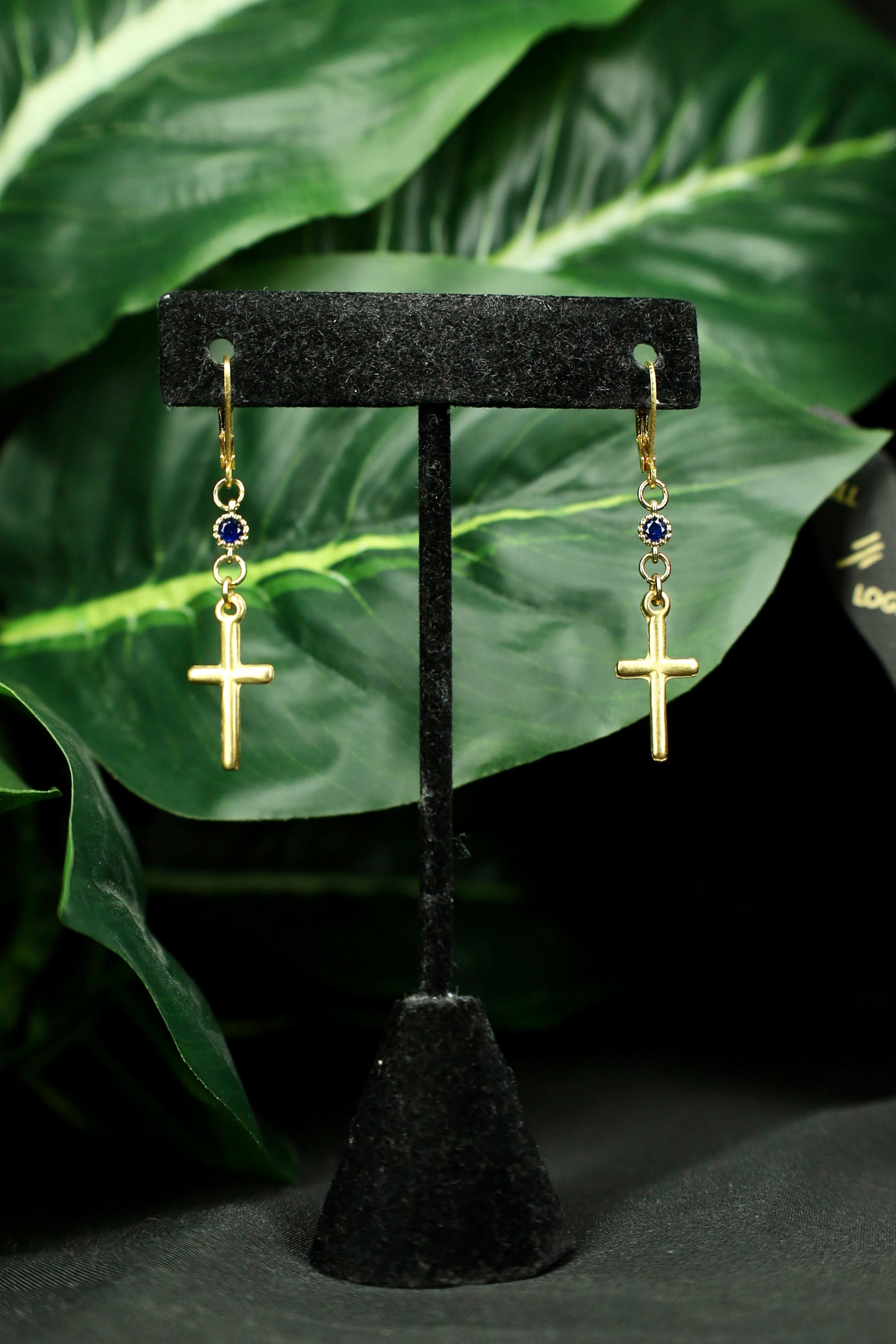 Beautiful gold cross pendants, adorned with sparkling sapphire-toned crystals, hang from gold-plated lever-back earring hooks. Crafted with hypoallergenic, nickel-free materials, these gorgeous earrings measure 1.25 inches in length.