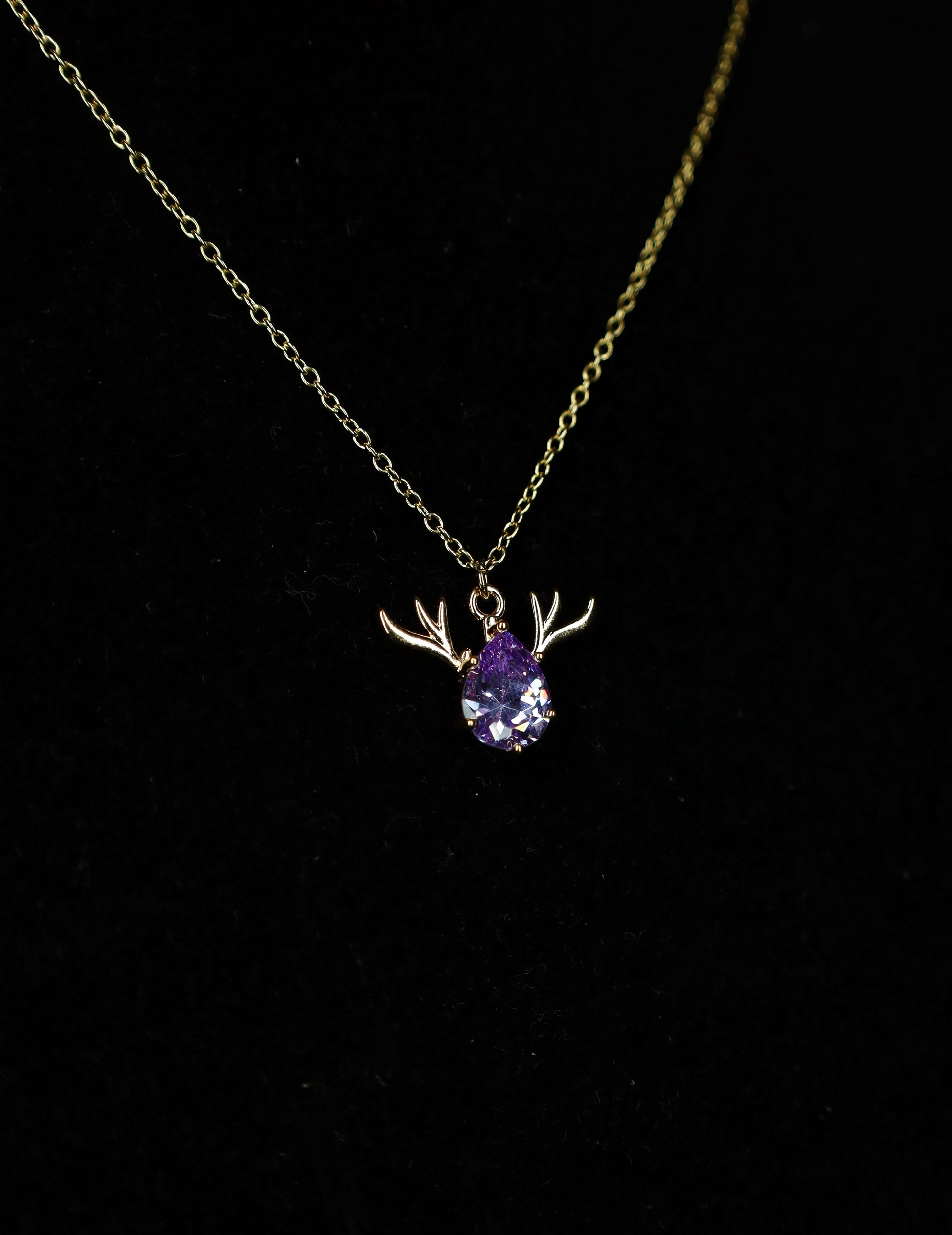 Necklace - Purple, glass gemstone featuring brass antlers on 18”, gold plated, hypo allergenic and nickel free chain.